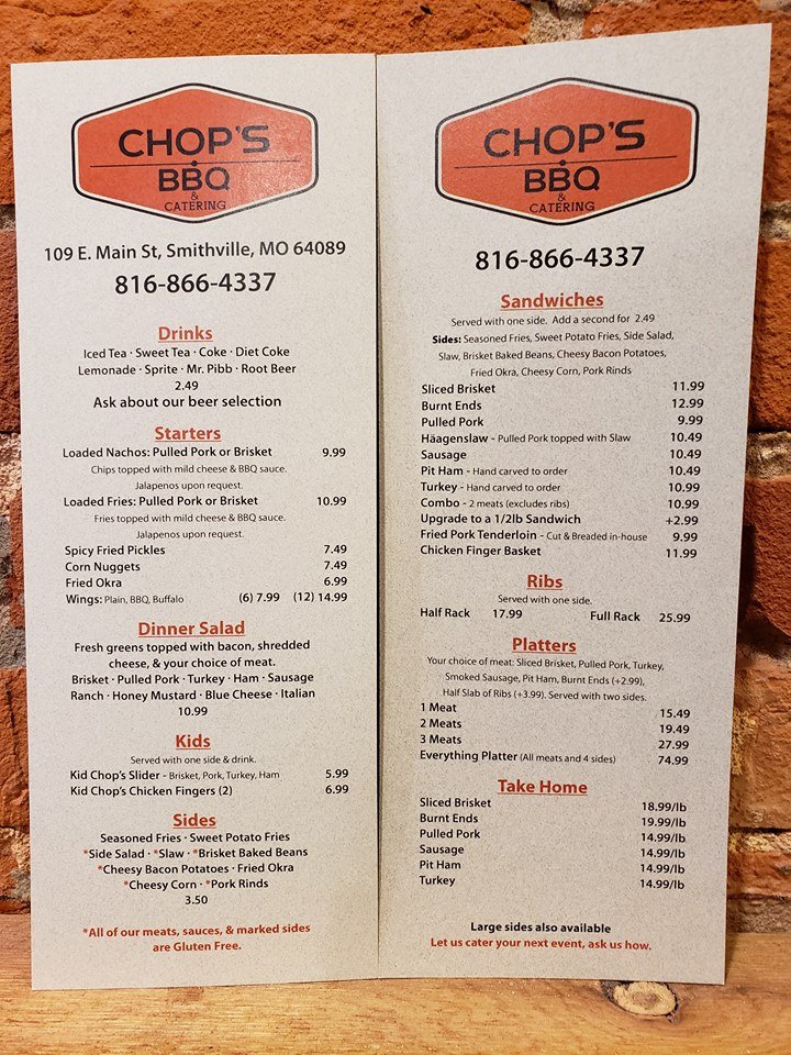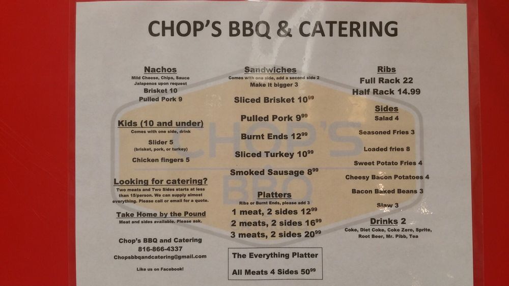Welcome to Chops BBQ and Catering, a hidden gem nestled in Smithville, MO, that promises a delightful barbecue experience. The menu here is a mouthwatering celebration of classic smoked meats, with highlights that include tender brisket, fall-off-the-bone ribs, and savory pulled pork. Each dish encapsulates a perfect harmony of smoky flavor and juicy tenderness.